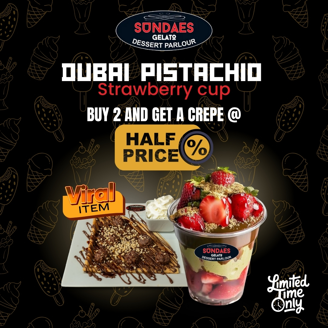 Discover the flavours everyone is talking about. From our classic Sheeryakh and authentic Jala to the TikTok-famous Viral Dubai Chocolate & Strawberry Dessert. Every bite at Sundaes Gelato Harrow is crafted to delight.