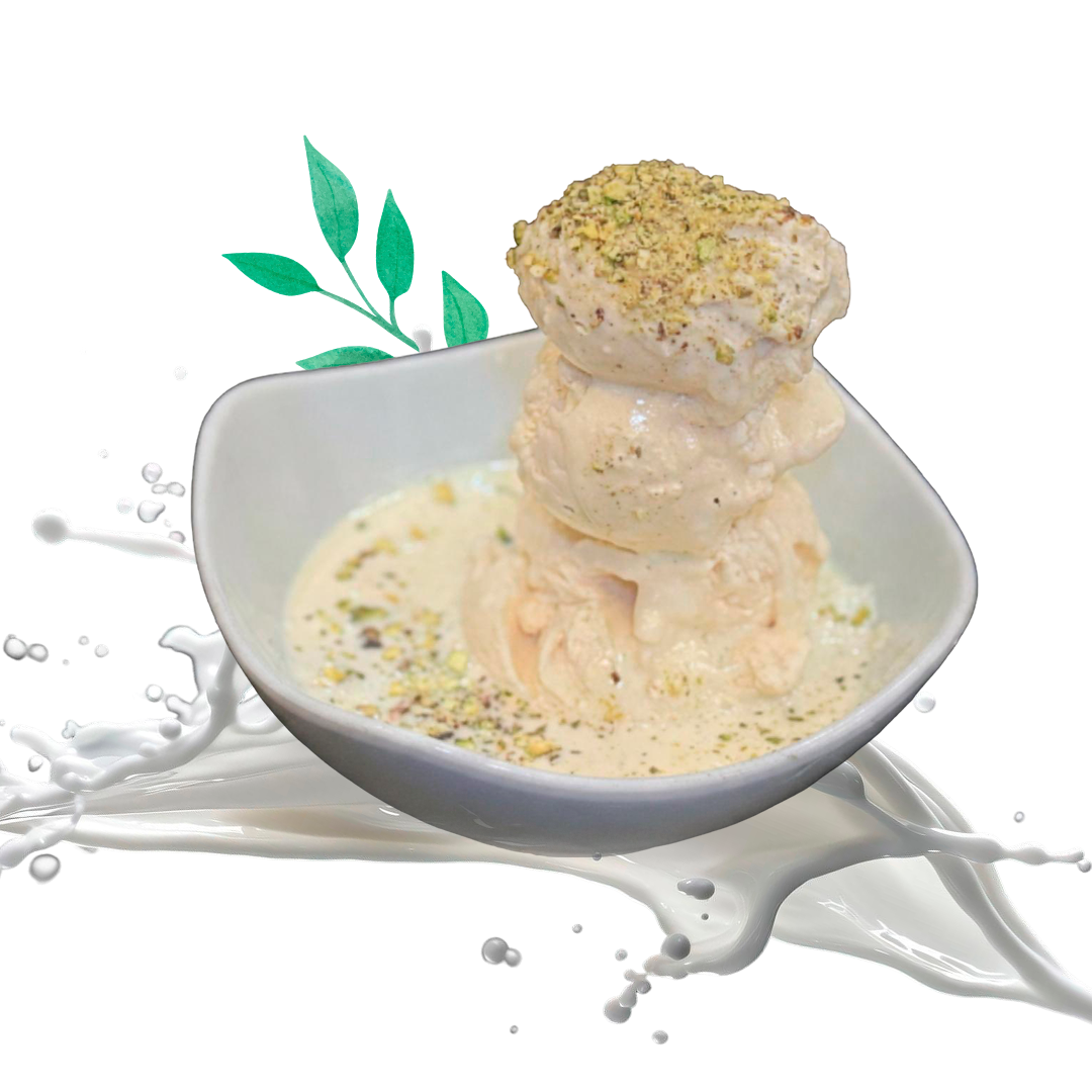Authentic handmade Afghani ice cream, made using traditional methods with no machinery. Prepared from condensed milk, sugar, and cardamom, and topped with pistachios and a drizzle of creamy malai or qimaq (optional).